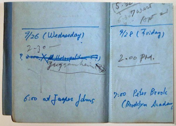 上図のとおり、瀧口の「旅の手帖」には万年筆やボールペン(ないし鉛筆)によって、1日に1項目程度の簡潔な書き込みが認められる。記載された事柄は、実際の行動の記録かもしれないが、9月24日に瀧口がロックフェラー三世財団のオフィスを訪問した際に、ポーター・マックレイに組んでもらったスケジュールかもしれない。仮にそうだったとしても、瀧口がこのスケジュールどおり行動したか、確実なことは判らない(記載が訂正されている箇所も散見される)。