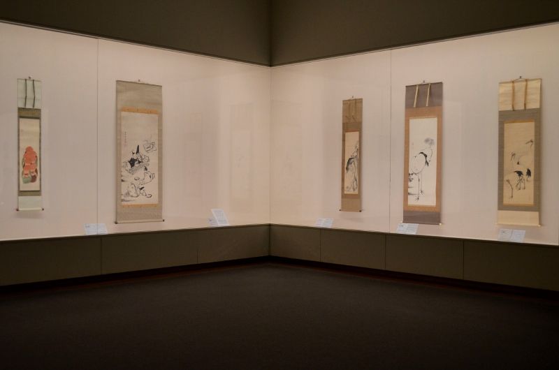 写真は向かって右から松村景文《三羽鶴図》、伊藤若冲《菊に双鶴図》、長沢芦雪《眼下千丈図》、伊藤若冲《三十六歌仙図》、伊藤若冲《伏見人形図》が展示されているケース。