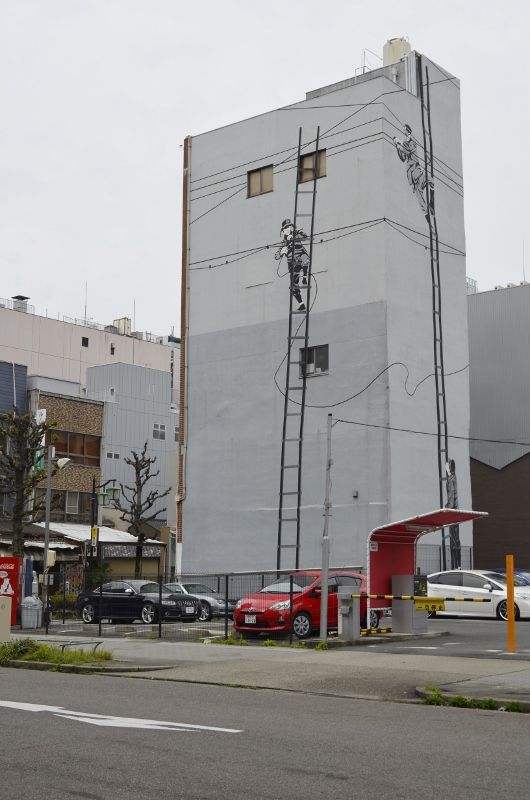 白い輪郭で縁取られた青い構造物は、ダリ風の時計や蜂などのイラストが施され、白字で「未来へ繋ぐ階段」と書いてある。二次元の空間に迷い込んだような錯覚に陥る。打開連合設計事務所《長者町ブループリント》2013年