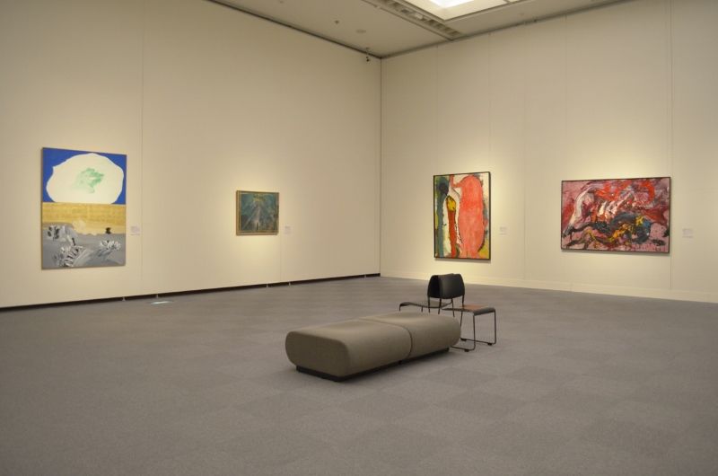 右の赤い作品は白髪一雄、その隣に元永定正、加納光於、田淵安一と作品が並ぶ。作家によって異なる奇抜な色と形を比較し、その制作過程を想像してみると面白い。