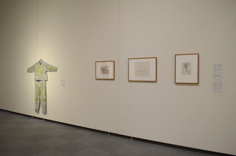 虫ピンで留められた厚紙だけのキャプションには、学芸員が展示に傾けるこだわりを感じる。額に入っている3点の素描は麻生三郎で、奥は設楽知昭《目の服・上衣》。人が衣服を着用して、ちょうど地に足が着く位置に展示してある。
