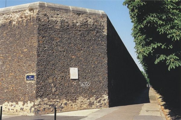 赤瀬川原平「犯罪ダム」あとで知ったことだが刑務所は撮影禁止だそうで、カメラを向けるとパトカーが寄ってくるらしい。右側の影になった塀側はアラゴ通りで、マロニエの並木の中にヴェスパジェンヌ(財政対策として有料公衆トイレを設置したローマ帝国のウェスパシアヌス皇帝にちなんだ名称)と呼ばれるパリ最古の男性専用小用トイレがあり、これは無料である。ロバート・フランクが赤瀬川さんとほぼ同じアングルで撮った作品にはこのトイレが写っている。
