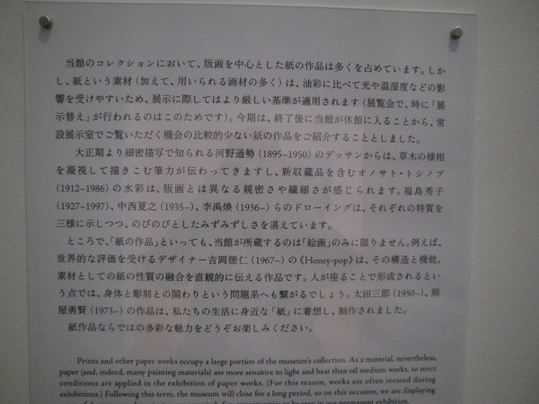 <紙を素材とした作品の展示は、保存上の理由から照度や期間など多くの制約が課されています。そのような理由から、「MOTコレクション」でもなかなか多くをご紹介できませんでした。そこで今回は、これまで展示の機会の少なかった作品を含め、多彩な紙作品をご紹介します。当館ならではのラインナップで「紙の上の作品、紙による作品」の数々をお楽しみください。(同館HPより)>