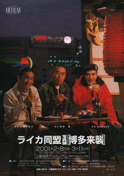 高梨豊「自我の芽ばえ」東区箱崎展覧会は「ライカ同盟写真展[博多来襲]」と銘打ち、撮影開始から約1年半後の2001年2月8日から始まったが、その間に主催者が替わり、会場は福岡市中心街の天神・イムズの三菱地所アルティアムに変更となった。この展覧会に合せて、ライカ同盟が選ぶ公募の市民写真展「博多地撮り」も同じイムズ内のfmfukuoka/GAYAで同時期に開催した。10日にトークや表彰式などオープニングイベントが行われ、パーティは恵比寿流主要メンバーによる「祝いめでた」と「手一本」で始まった。