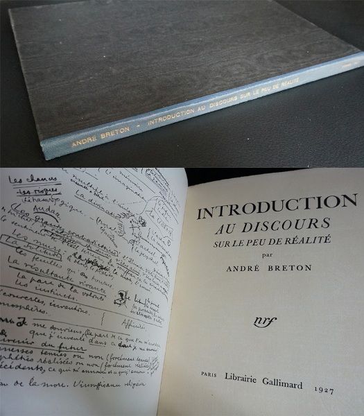 breton8ブルトンの墓碑銘「Je cherche l'or du temps(「私は時の黄金を探す」)」の言葉が載っている『現実僅少論序説』(INTRODUCTION AU DISCOURS SUR LE PEU DE RÉALITÉ, Librairie Gallimard 1927)。「現実僅少論」-現実は幻想であり、見えないもののなかにこそ真実の世界があるとも解釈できるこの本のタイトル。それがシュルレアリスムの作法のすべてを物語っているような気がして、本の内容というよりもそのタイトルに「言葉のオブジェ」として強い衝撃を受けた記憶がある。