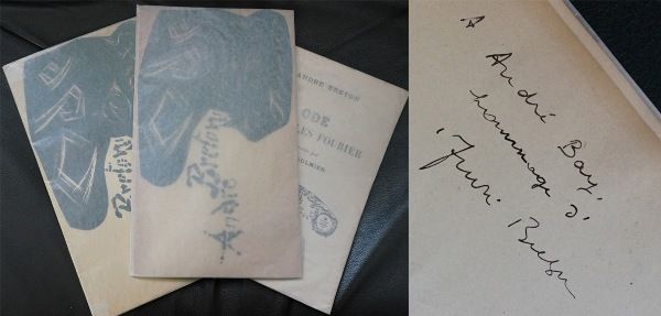 breton9『シャルル・フーリエへのオード』の署名本。「エンドレスハウス」など不定形で有機的な建築で知られる建築家フレデリック・キースラーによる凝った装丁。仏語版『不思議の国のアリス』(ルイス・キャロル)の訳者André Bayへの献辞とブルトンの署名(写真右)。