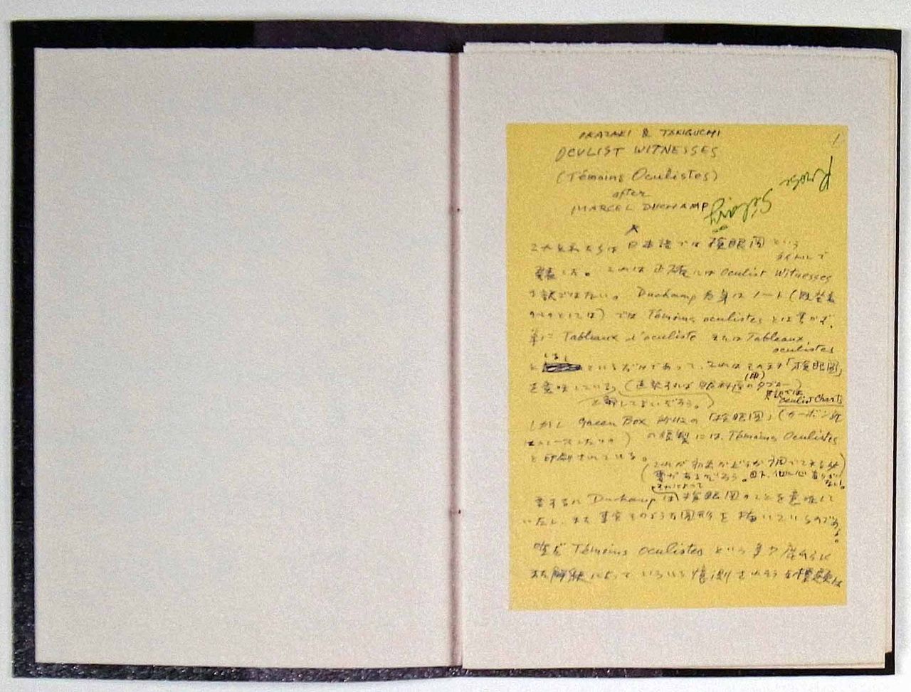「檢眼圖」の製作に並行して書き溜められた瀧口の手稿が、手作り本「檢眼圖傍白」(図23-8,9)としてまとめられており、製作に当たってデュシャン「グリーン・ボックス」所収のメモをはじめ、さまざまな文献が参照されていたことが判る。(次号に続く)