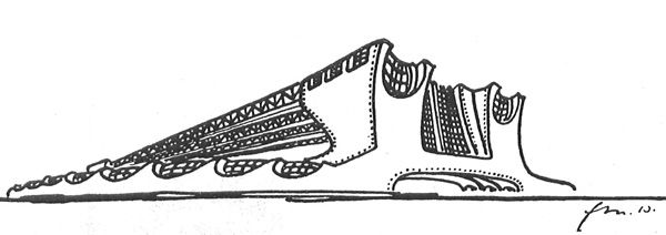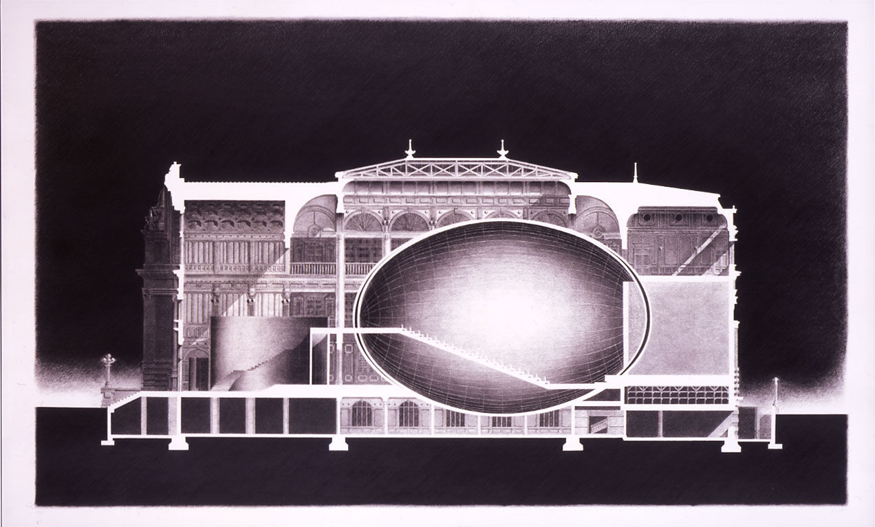 コントラストの強烈さ、明快さ、そしてスピードあるタッチで描かれる幾多のドローイング、ここには来たるべき建築の造形はあたかもこのスピードがなければ予見し得ぬといわんばかりの信念が溢れている。とくに、シンメトリーや水平性には、絶対の確信、いや、信仰にすら近い感覚を見ることができるだろう――そこには「世界の軸性」をいささか隠喩的なポーズで示そうとするル・コルビュジエよりも、はるかに徹底したフォルムのフィロソフィーがある。常にアイレヴェルから仰ぐようにそびえるマッスは、多くの場合、片立面が陰影として描かれ、この光の作用によってマッス=質量を運動化する効果を醸し出す。とすれば、ダイナミズムとは、明らかに、このマッスとそこに充電されたハイ・ヴォルテージのエネルギーとの相関であり、錬金術の塩にも代わる「光」があたかもこの相関の触媒の役割を担うという古典的な三位一体の構図の新訳がここに垣間見れるのではないだろうか。