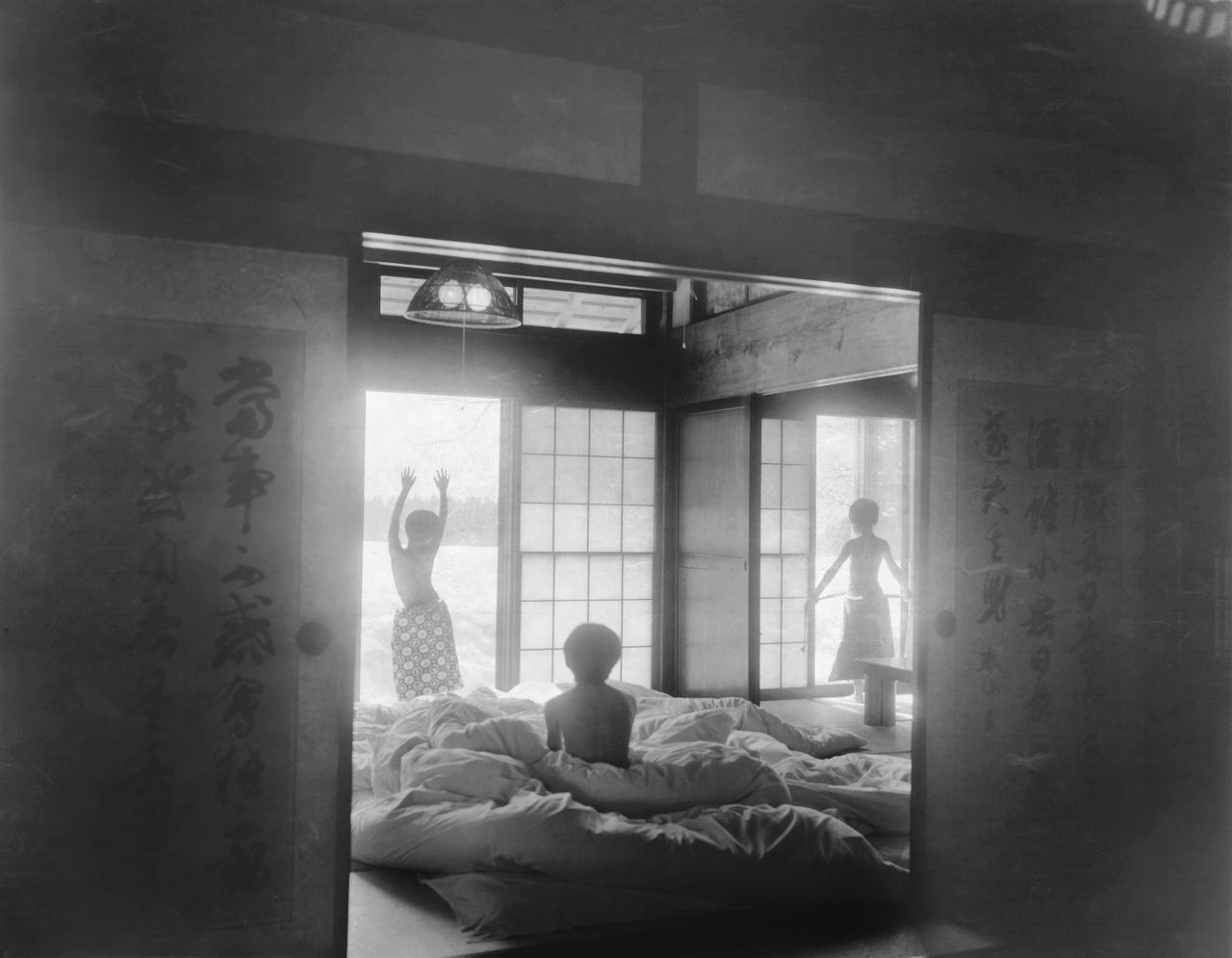 外に面した側は障子で、手前側は唐紙、ふたつの部屋を仕切るのは板戸である。畳の上には布団が敷かれ、その上には竹製の傘がさがり、丸い電球がふたつ灯っている。