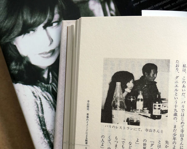 平沢淑子さんの周辺の著名人・寺山修司(『月時計のパリ』 講談社 1984年より)。バックの写真は若き日の平沢淑子さん(画集『Yoshiko』 Somogy éditions d'art ,Paris 1999)