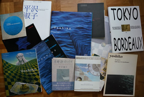 平沢淑子関係の本、資料の一部。写真右端上は、限定三部で手作りした東京とボルドーの平沢淑子展と「不意打ち的」に訪れた旅を記録した写真集「TOKYO-BORDEAUX」 。平沢淑子さんの作品には、水をテーマにした「ウォーター・ピラミッド」、「プリズム化する水」シリーズ、絵画的実験の「妖精の距離」、「遊戯の空間」を描く「ラ・マレーヌ」のシリーズなど抽象的で精神性を求める作品が多い。細密画のポートレートや、発光ダイオード”により波動する実験的な「緑の光線」のシリーズもある。