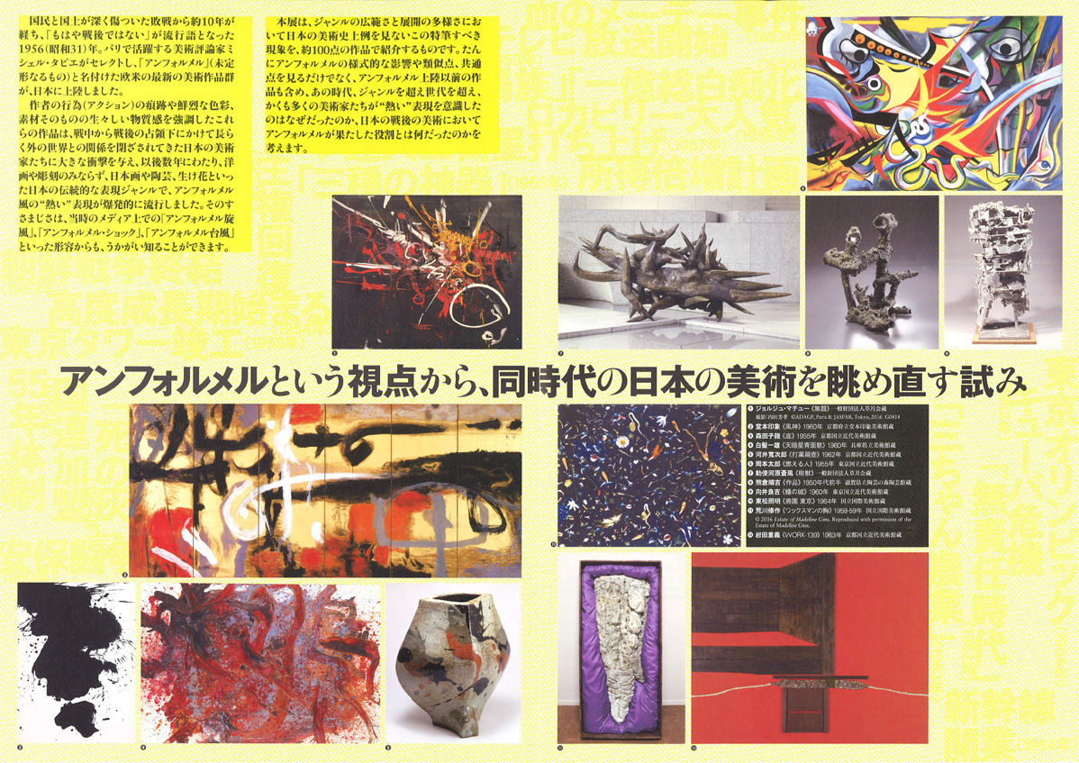作者の行為(アクション)の痕跡や鮮烈な色彩、素材そのものの生々しい物質感を強調したこれらの作品は、日本の美術家たちに大きな衝撃を与え、以後数年にわたり、洋画や彫刻のみならず、日本画や陶芸、生け花といった日本の伝統的な表現ジャンルで、アンフォルメル風の"熱い"表現が爆発的に流行しました。