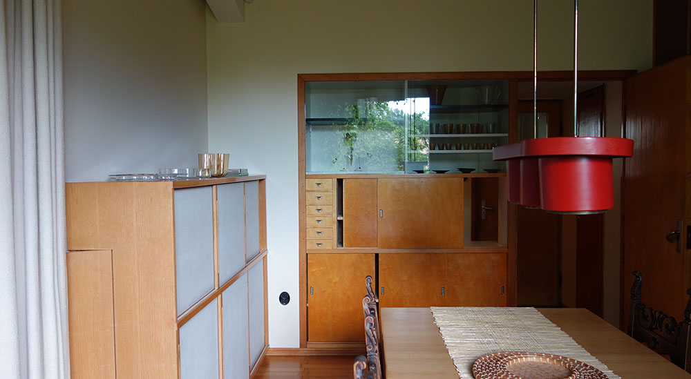 アイノがデザインした正面の戸棚は、手前のダイニングと奥にあるキッチンの両側から開けることができます。