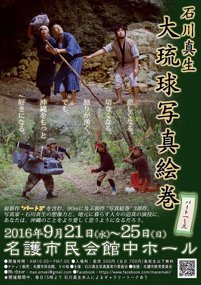 9月21日から25日の会期で、「石川真生 大琉球写真絵巻」展が名護市民会館中ホールで開催されます。展覧会の開催に向けて制作費・会場費のカンパも募集しています。詳細は石川真生のブログ及びFacebookページをご覧下さい。