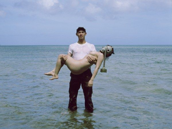 「米兵」(図8)では、裸で顔にガスマスクを装着した状態で、海の浅瀬に立つ男性に抱きかかえられており、「戦争中にアメリカ兵に助けられた日本人の女の子」という説明文と相まって、第二次世界大戦や、沖縄と米軍にまつわるさまざまな問題、米兵による暴行事件などを連想させ、背景に広がる青い海や空の下に横たわる歴史や現代の差し迫った問題が暗示されています。「食卓」(図7)と同様に、吉山が裸で演じることによって、夢の中の出来事にとどまらず、現実に差し迫った問題のありようが鮮明に浮き彫りにされていると言えるでしょう。