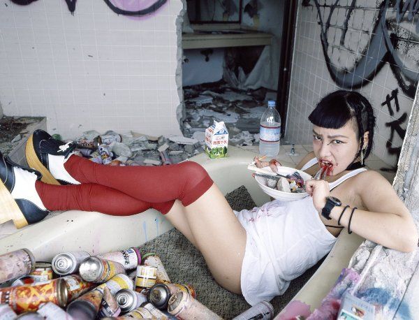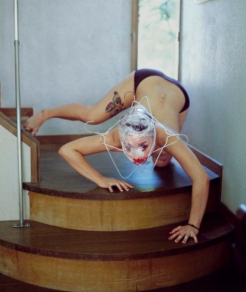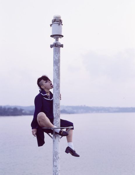 表紙(図1)の装丁にも使用されている作品(図4)では、取り壊されたバスルームでバスタブの中で寝そべりながら、瓦礫やスプレー缶、壁に書き散らされたグラフィティに囲まれ、瓦礫を貪り口から血を流しており、苦しみや混乱、攻撃性がないまぜになった心理が場面全体に表出しています。(図4)と同様に閉塞的な室内空間の中で心理状態が表現された作品として、「ハンガー」(図5)があります。頭にラップをまきつけ、ワイヤー製のハンガーを填め、階段の踊り場で這い回るようなポーズをしています。「ハンガー」(図5)のように、身のまわりにあるものや環境に衝動的に反応するようにして、自分の内面を曝け出すような吉山の身体表現は、「ポール」(図6)においても際立っています。学校の制服(社会からの抑圧や強制を表わすものとして、作品の中で頻繁に登場する要素)を着て、海辺のポールによじ登り、右手に煙草を持って、誘うような視線をカメラに向けながらポールを舐める姿は、エロティックで挑発的です。