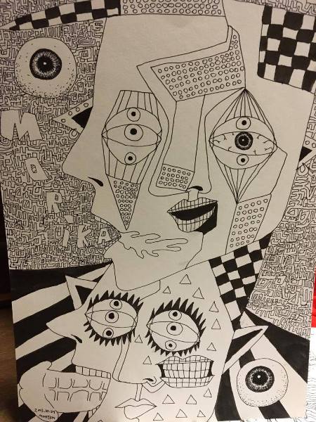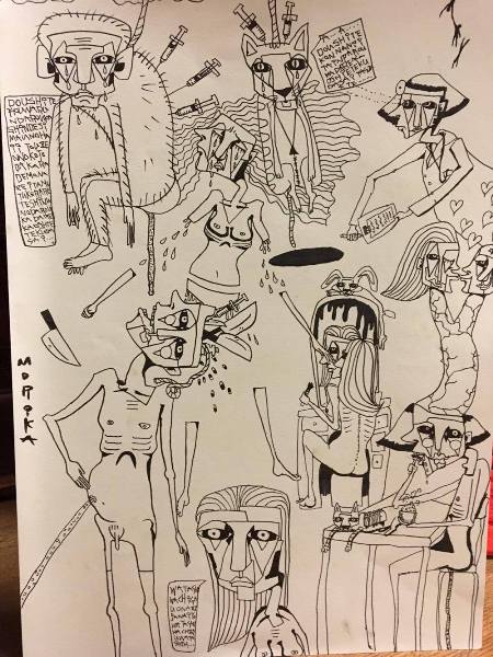 それぞれの写真に添えられた説明文には、夢の内容にとどまらず、吉山の感情が綴られており、写真集の所々で挿入される吉山の手によるイラストは、刻みつけられたり、引き裂かれたり、増殖したり、ほかの生物と合体したような身体(図2)や、分裂したような顔(図3)が、紙面全体を覆うような線で描かれています。恐怖や不安に取り憑かれ、強迫観念を抱く心情がそのまま視覚化されたようなイラストと、吉山がカメラの前で演じた場面の写真、説明文の言葉が相互に混じり合い、「夢の世界」が複合的に描き出されています。