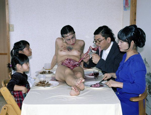 内側に潜む狂気や暴力性、性的な欲望などを、吉山一人で演じた作品に加えて、他の登場人物と共演して作り出された場面の中では、夢の内容は人間関係や家族、政治、歴史など社会的な側面に関わって、より具体的に描き出されています。「食卓」(図7)では、家族が食事をする食卓の上に裸で横たわり、お腹から内臓が引きずり出されるような状態になっている様子は、グロテスクで、ブラックユーモアを帯びながら、沖縄の視点から見た日本に対する批判的なメッセージに充ちています。