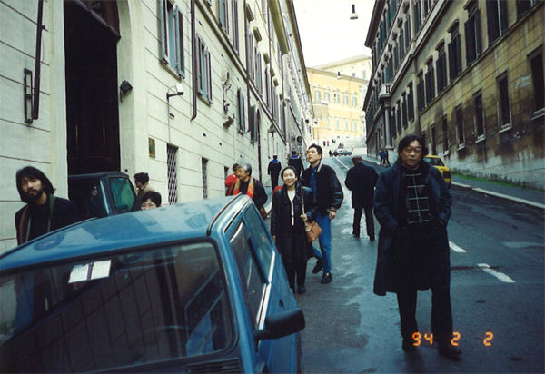 1994年2月「ミケランジェロのピエタ像4体のすべてを観るローマ、フィレンツェ、ミラノの旅」右から、上田浩司さん、松井裕子さん、社長(車の屋根に隠れて顔半分)、戸村茂樹さん