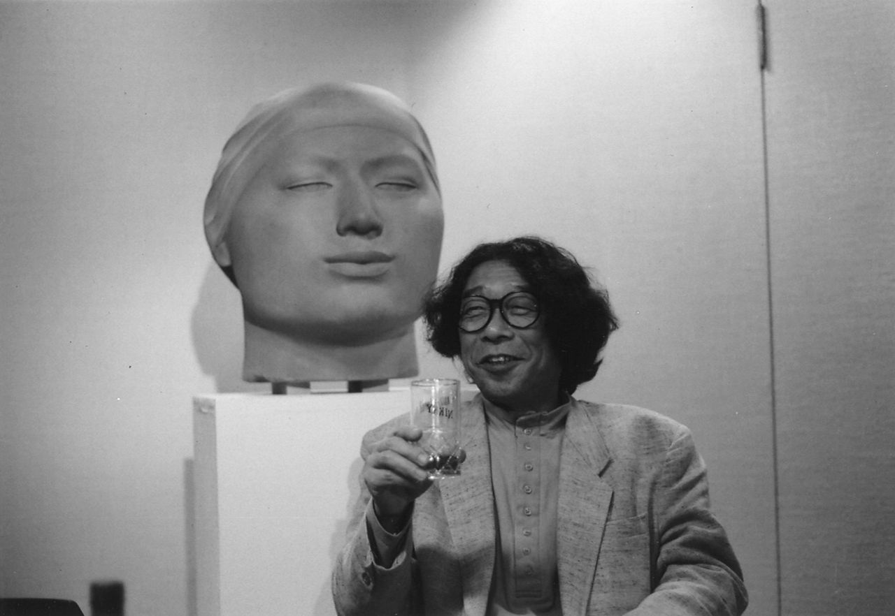 在りし日の上田浩司さん。彫刻は照井榮さんの作品。