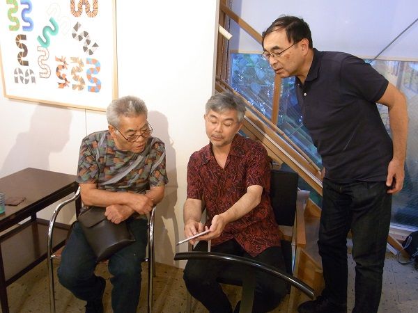 ちょうど画廊に居合わせた土渕信彦さん(右)、大野幸さん(中央)と関根先生。