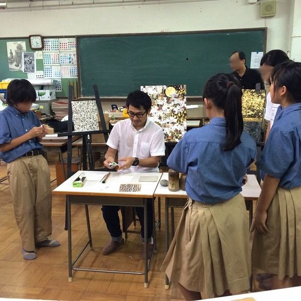 9月5日、「temiru」という、京都市の全ての中学校、高校、芸術系の大学に配布されるフリーペーパーの取材で、京都市立醍醐中学校に放課後伺い、美術部の部員さん7人と、てみる君に箔画体験をしてもらうワークショップをしてきました。