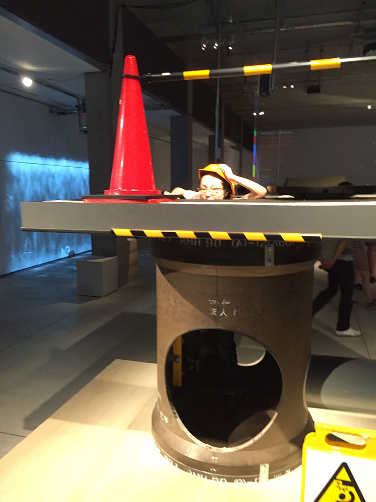 展示物のマンホールから顔を出す。「工場萌え」という言葉はすっかり市民権を獲得し(wikipediaにも登録されていました)、軍艦島こと端島の炭鉱跡も人気を誇っています。端島を含む明治日本の産業革命遺産が世界遺産に登録されたことも記憶に新しいです。スケールの大きな「土木的なもの」に惹かれる気持ちは、誰もが少なからず持っているといえるでしょう。展示にはそんな心をくすぐるように、壁面一杯のプロジェクションや写真、等倍の土管や左官仕事の作品などが並びます。メディアアートのような作品もありましたが、土木の仕事を分かりやすく表現する、という意図がよく伝わりました。ディレクターである西村浩氏の前文にあったように、土木の仕事を「ビジュアライズする」ことには成功しているといえます。しかしそれだけに、筆者が関わるアーカイブ資料の展示とは、大きく手法が異なるなとも感じました。