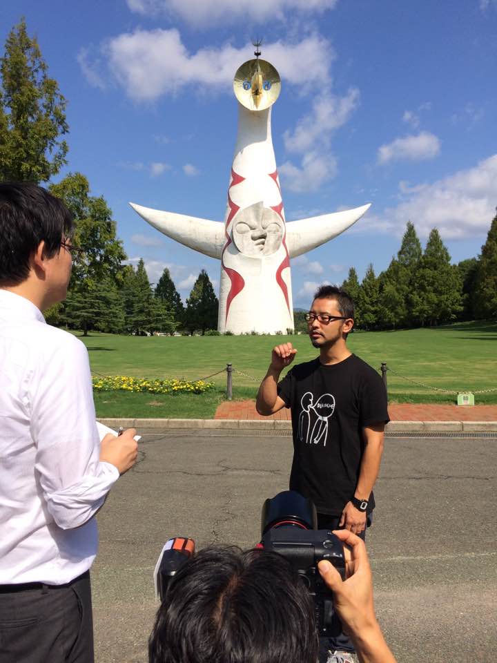 さっそく太陽の塔の前で取材を受ける関根光才さん