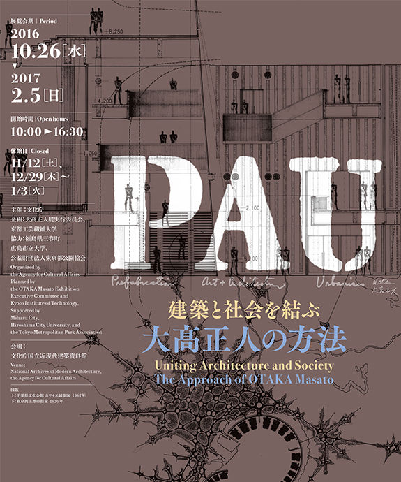 今回の展覧会では、大髙が掲げた3つの理想の融合をキーワードとしています。3つとはすなわち、P = Prefabrication、A = Art & Architecture、U = Urbanismで、大高はその頭文字をとって「PAU」とし、大髙事務所が手がけた仕事の件名番号の頭にもこの文字をつけました。主に初期に試みた工業化への取り組みと、大髙独特の造形へのこだわり、そして都市への取り組み。この「PAU」は生涯を通じて大髙の仕事のテーマとなっていたと思われます。その根底には、常に建築を社会的な存在として捉える大髙の姿勢があったといえます。それは、現代においてこそ意識的に考えていかなければならないことではないでしょうか。この展覧会については、来月以降も継続してお伝えしたいと思います。
