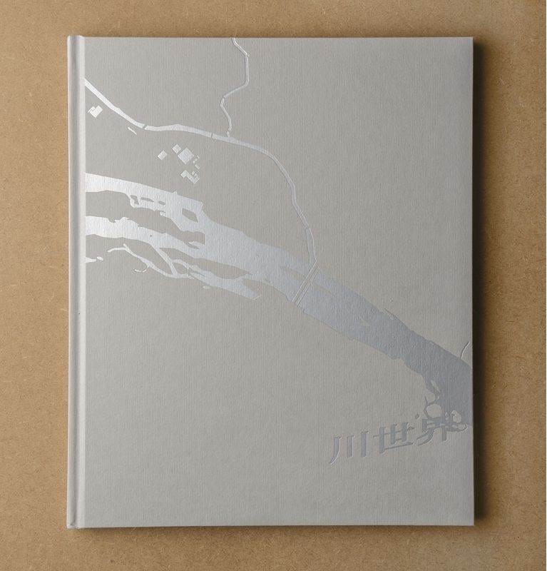 今回ご紹介するのは吉江淳(1973-)の写真集『川世界』(Salvage Press, 2016)です。この写真集は、吉江が生まれ育った群馬県太田市の端を流れる利根川の川岸の風景を、およそ15年間にわたって取り続けた写真をまとめたものです。表紙(図1)にはシルバーの箔押しで地図から引き写された川の輪郭が象られており、周辺の地名を削ぎ落とされた川は、抽象絵画の断片のようにも映ります。