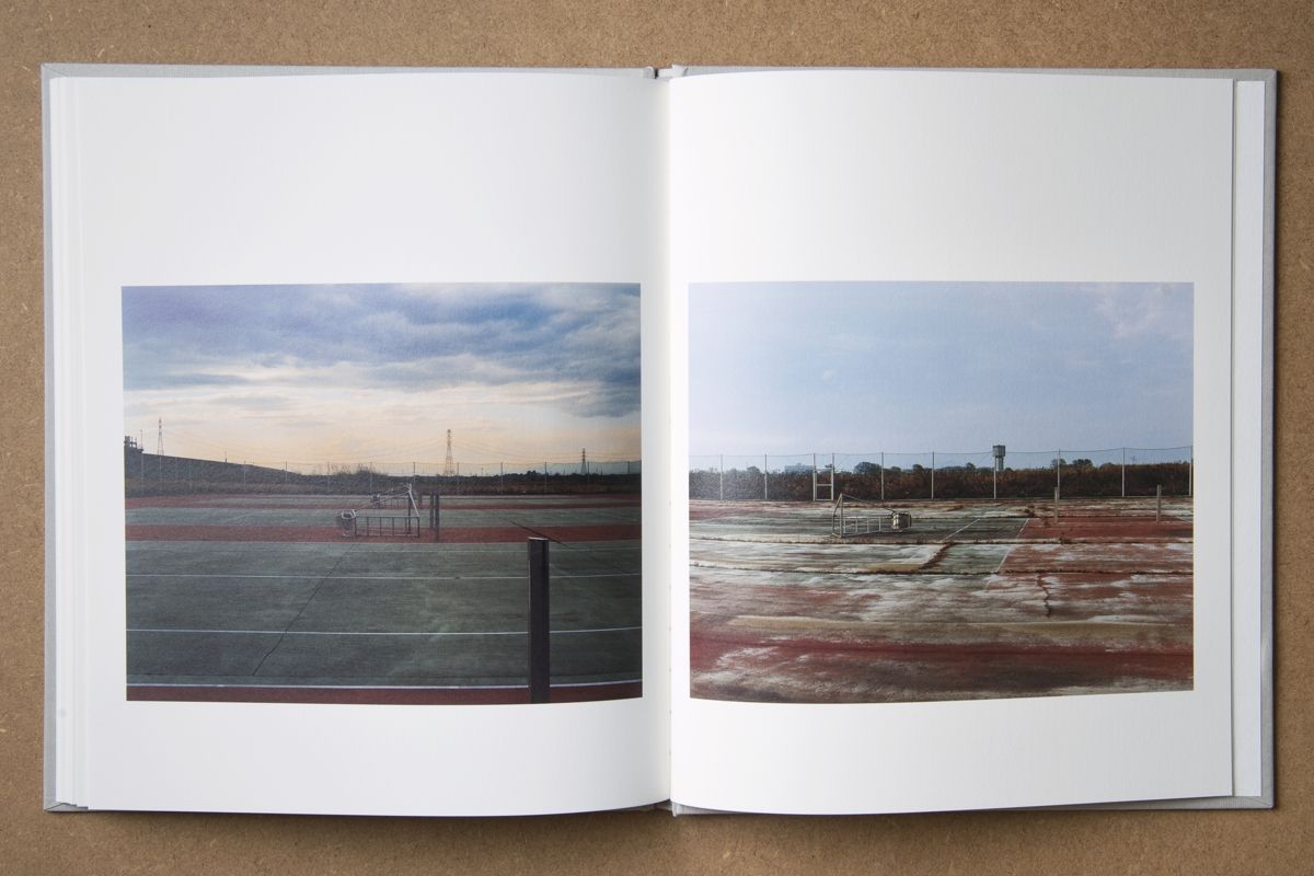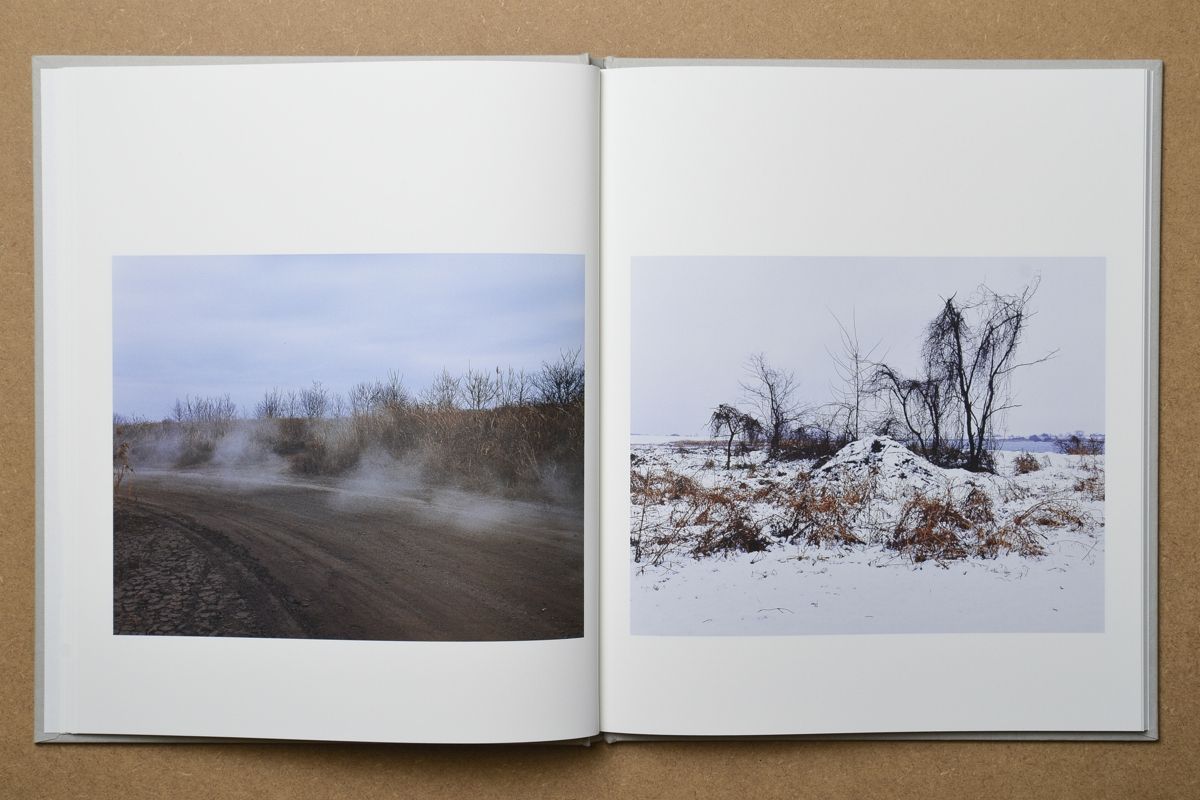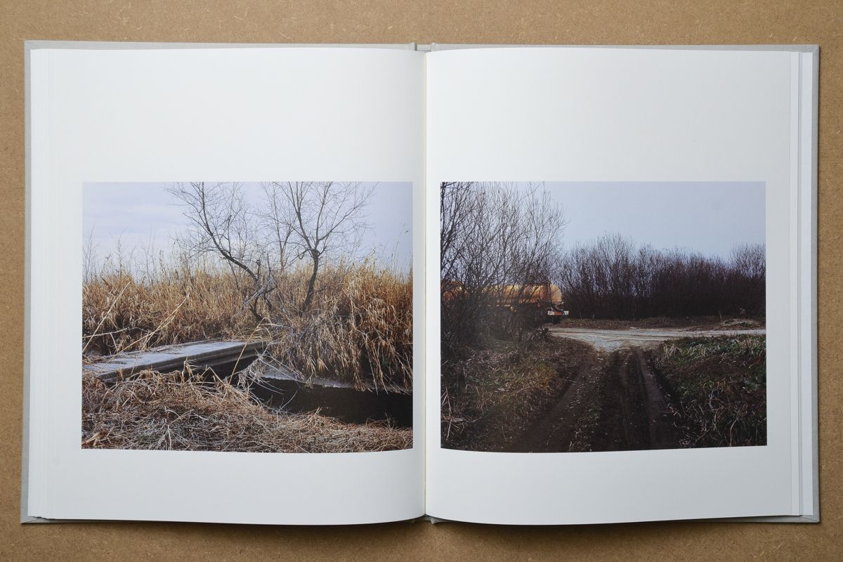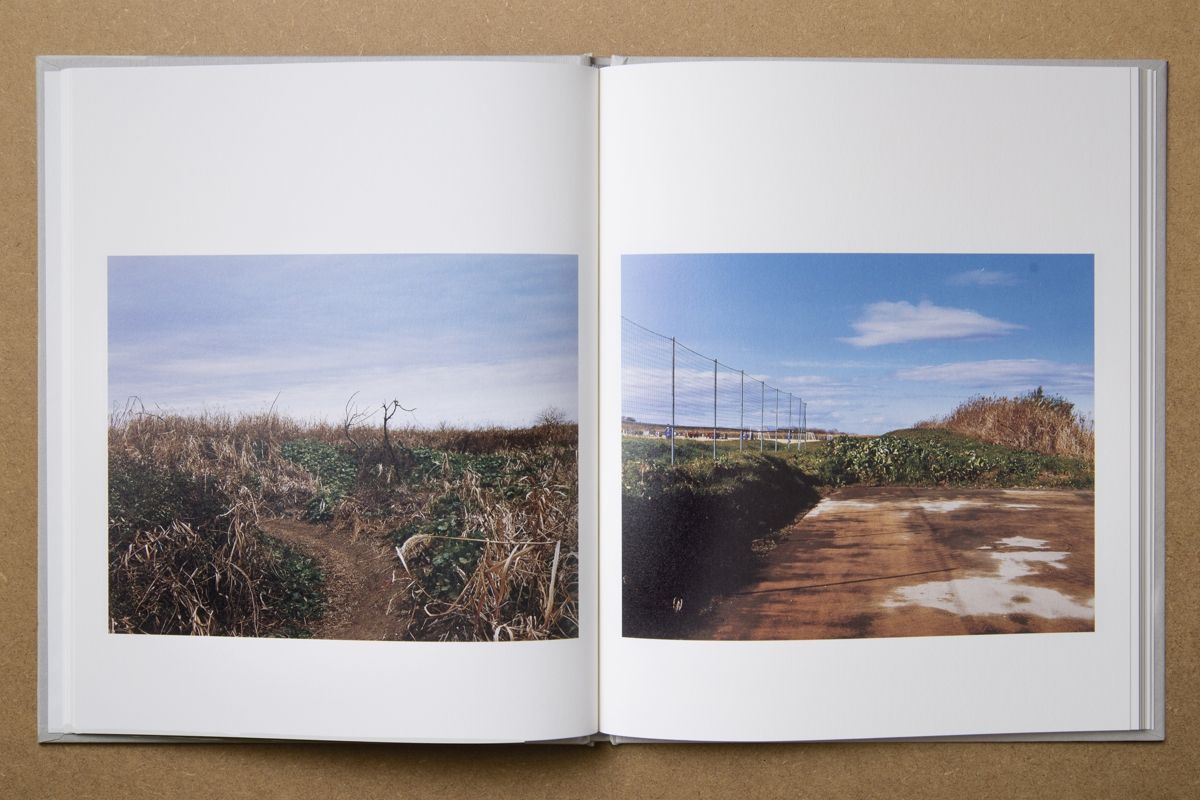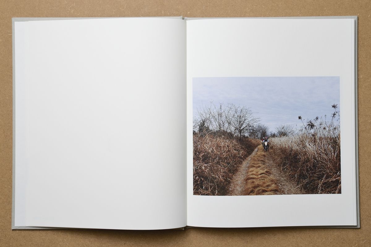 (図4)写真集には、流れゆく水面や、川を含めた流域の景色を捉えたものよりも、川岸に生い茂る草木や、遠景に見える高架道路や橋、川辺の造成地を通過するドラックやバイク、小さな畑、工事現場の標識、何がしかの目的のために建てられた小屋といった川岸にあるものや景色、あるいは川岸から見える景色を捉えたものが多く含まれます。(図2、3、4)縦長の判型のページの下の方に写真が配置されているというレイアウトにより、写真に捉えられている空間の地面の広がりが強く意識されると同時に、景色が捉えられたその時々の空の色や雲の形や広がりが印象に残ります。写真集のページを捲っていくと、一連の写真は確かに川岸で撮影されたものらしいが、一体どのような場所を見ているのだろうが、訝しく不思議に思うような感覚が湧き上がってきます。