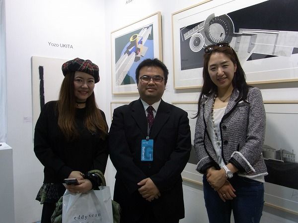 ブースにご挨拶に来てくださった作家のハ・ミョンウンさん(右)と、インスタレーションアーティストご友人(左)。ハさんは来年1月のArt Stage Singapore 2017でときの忘れもので作品を展示させていただく予定です。