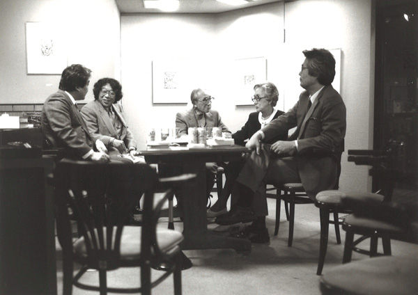 左から、六岡康光さん(当時岩手日報文化部記者、後に石神の丘美術館の芸術監督)、上田浩司さん、難波田龍起先生、夫人の澄江さん、中村光紀さん(当時岩手日報事業部)