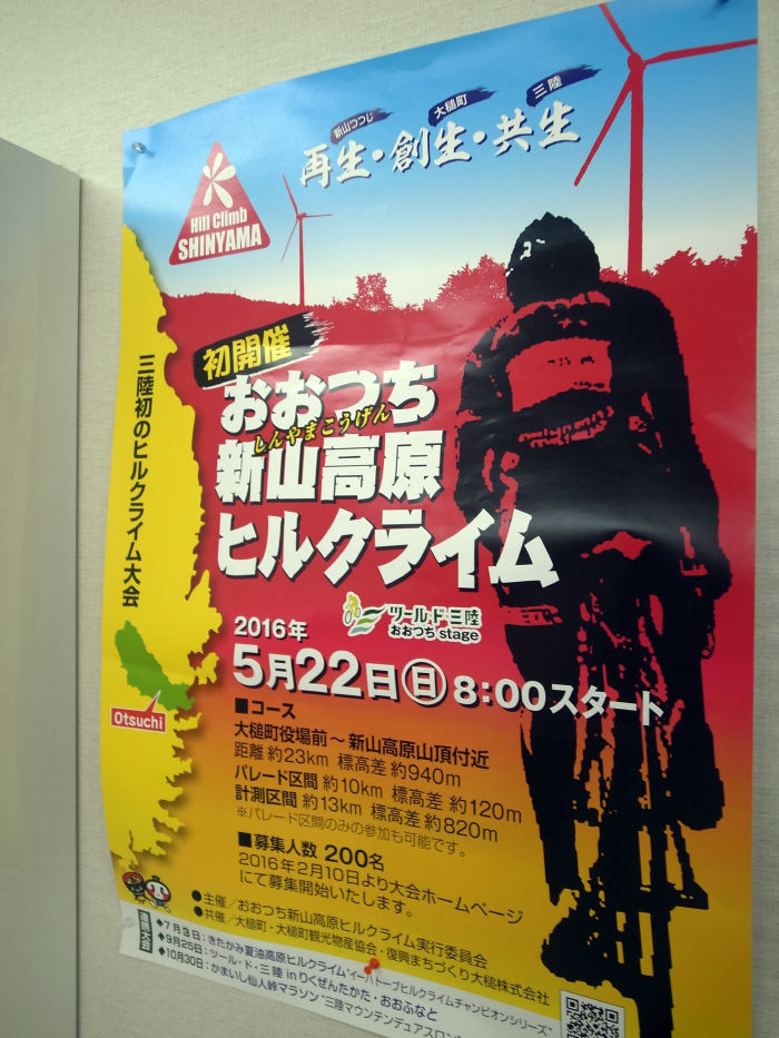 そのような中で、この大槌新山高原ヒルクライムは、東日本大震災からの復興と再生を目指した三陸初のヒルクライムイベントとして開催された。主催は「おおつち新山高原ヒルクライム2016実行委員会」だが、共催が「大槌町観光物産協会」と復興のための第三セクター「復興まちづくり大槌株式会社」、主催協力として「大槌町」とあり、大槌町が一丸となって取り組んでいるイベントである。大会理念として「再生」、「創生」、「共生」を掲げ、震災からの復興の一つとして、自転車をコンテンツとしたアプローチを行っている。