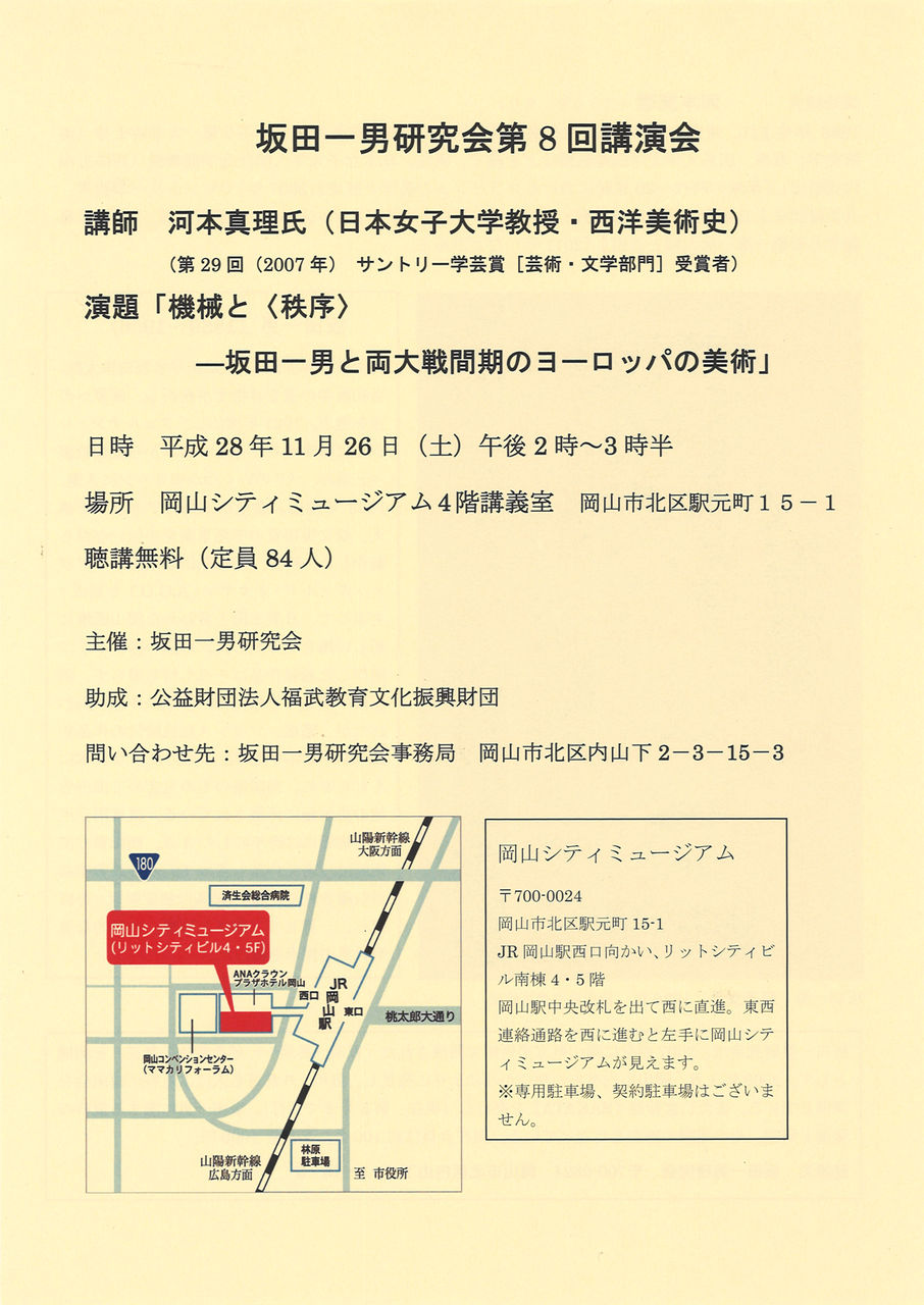 坂田一男研究会の中野典子さんから、岡山で開催される講演会のご案内をいただいたのでご紹介します。