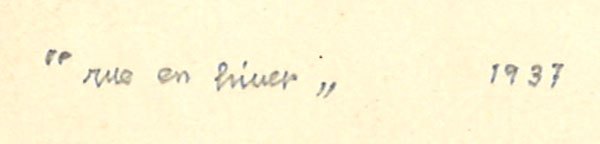 作品左下に鉛筆で<rue en hiver 1937>と記載。