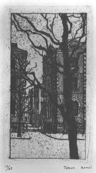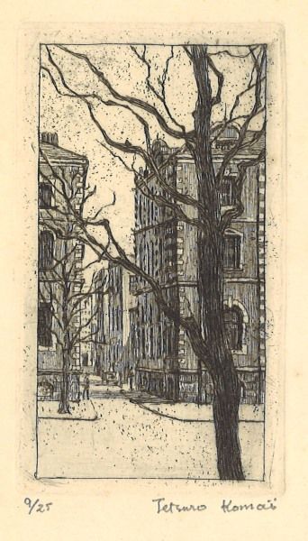 駒井先生が生前刊行した『駒井哲郎銅版画作品集』(1973年 美術出版社)に収録された227点(その他に賀状、案内状など10点を所収)のうち、一ページ大の口絵には56点が選ばれていますが(つまり自選の代表作)、そのトップを飾ったのがこの「丸の内風景」で、戦前の作品で掲載されたのはこの作品のみです。