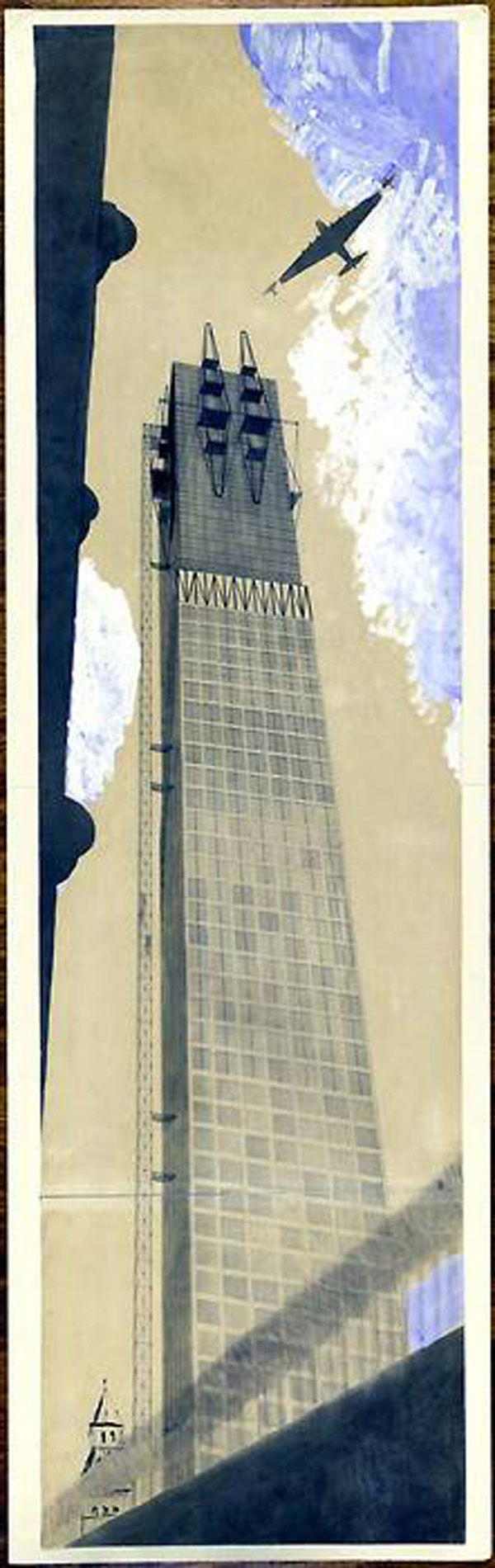 レオニドフのスタイルが建築のスタイルなのかドローイングのそれなのか殆んど見分けがつかないものであったという事実が、技術、経済性と並んで、彼のプロジェクトの実現性をあやぶませるものであったことは否定できない。しかし彼は短いその実質的なキャリアの最後期に、実際の建物のデザイナーとしても比類のない天才であることを呈示してみせた。重工業省のコンペ応募案がそれである。ここでも基本的なコンポジションはそれまでと同様にシュプレマテイスト的であり、その幾つかのタワーのシルエットは隣接するクレムリンの聖ワシリー寺院と著しい対照を示してはいるのだが、これまでのプロジェクトとは違って建築的な細部が克明に画きこまれている。おそらくは、実現性をめぐって既に声高く叫ばれていた彼への批判に対する答として提出されたこの計画は、モダユテイと口シア的なイコン性との異様な結合を示している。それをモダンでないということは誰にもできはしないが、ただモダンであるとだけいうこともできない。一切が比類のない造型力のうちに昂進されてしまっている。そのドローイングもそれまでの線描主義とは当然違っているが極めて美しく構図化され、淡い彩色が付され、彼のドラフトマンとしてのメチエの高さを示している。