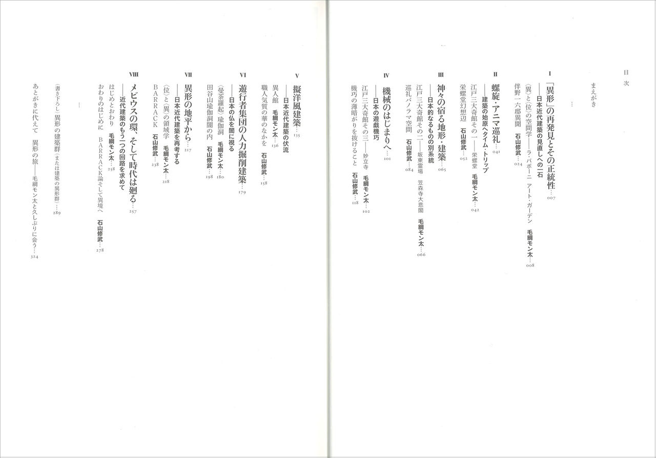 今の時代に本書が復活したその心は、現在という時代そのものもまた異形であるということだ。この本は過去の異形な遺物を収集したカタログ本では全くなく、明らかにモノの根原を凝視しようとする創作論としてある。著者二人のための創作論ではない。建築という創作世界自体を問い詰めようとする探求の書であり、その命題は広大甚大で現在もなお我々の前に横たわっているのである。巻末に付された石山の新論考「異形の建築群」は40年前の本文群に対する現在からの応答=注釈であり、探求は今なお続いていることを著者自身が表明してくれている。我々は心してその探求のキャッチボールの球の行方を追走すべきだろう。