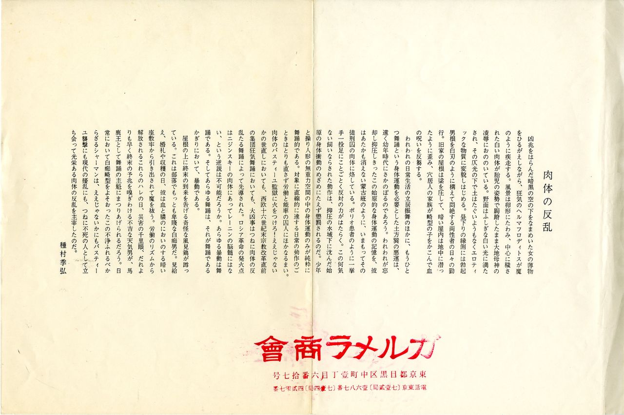 種村季弘「肉体の叛乱」。「土方巽と日本人」の公演の際に配布された