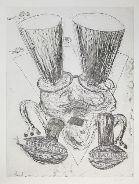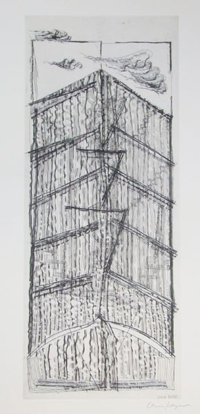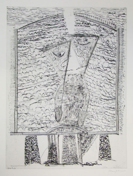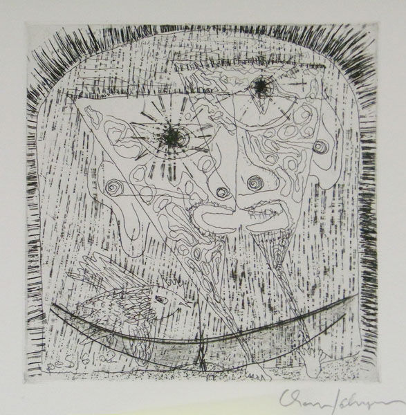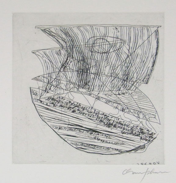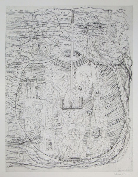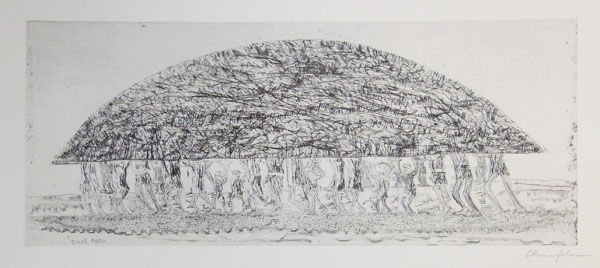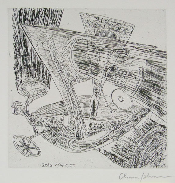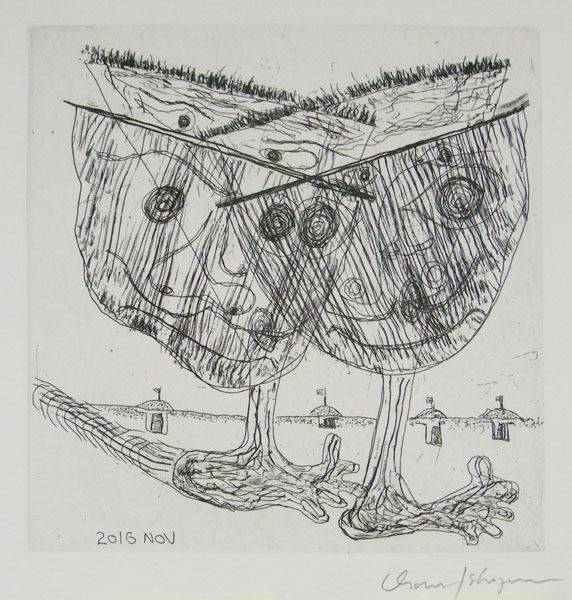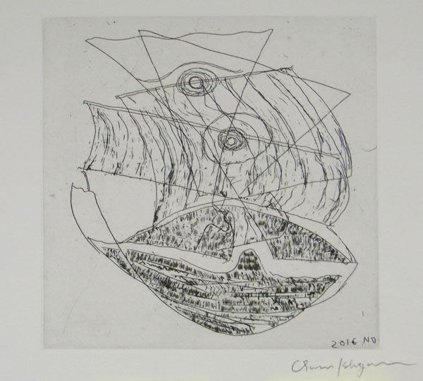 エッチング技法をご存知の方は、石山先生の「銅版を彫る」という表現に「?」と思うかも知れませんが、通常使うニードルという細い針だけではなく、「ノミ」まで使って実際に「彫って」います。つまり鍬や鋤で穏やかに畑を耕すのではなく、いきなりブルトーザーなどの重機器を持ち込み広大な原野を縦横無尽に走りまわっている感じですね。