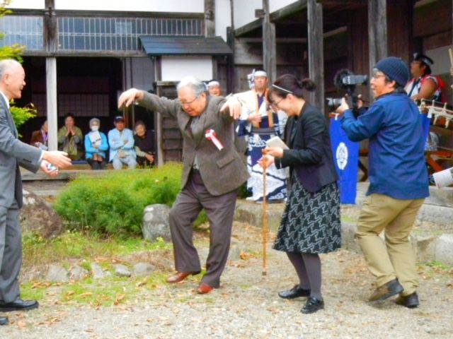名誉館長となる細江英公も東京から来秋し、開館セレモニーに参列しました。セレモニーの開始を告げる地元の西馬音内盆踊りの笛太鼓の演奏に合わせて、細江は杖を放り出して踊り出し喜びを表現していました。