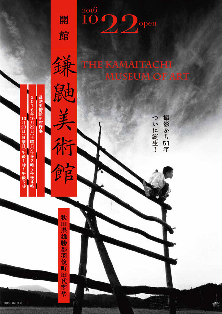 美術館の展示室は、本来は蔵の1階と2階を考えていましたが、開館時は1階だけを整備し展示室とすることとなりました。蔵の重厚な構えと見事な造作に見合った、品のある展示を行うことができました。開館には、写真集『鎌鼬』に写っている人たちも参加されて、細江も51年ぶりの再会に喜びも一入でした。