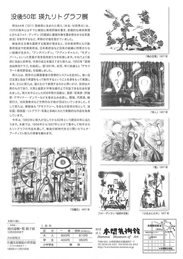 本間美術館では、これまで収蔵リトグラフによる瑛九と、彼と関連する展覧会を7回開催していますが、これからも近代美術史上重要な作家である瑛九の人と作品の紹介を続けて参ります。