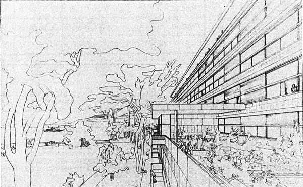 因襲的なアカデミズムは生涯を通じてル・コルビュジエの敵としたものだが、ボーザール流の手のこんだ大時代的な図面表現もまた彼のものではなかった。彼のドローイング・スタイルはペンの簡潔な線と簡単な色彩とだけから成り立っている。自からもまた敵からも「裸」のと形容されたそのスタイルにふさわしく、裸形の建築に陽光だけがふりそそぎ、緑が縁を飾る、そんなイメージだけをそれらのドローイングは送りつづけた。それはフリーハンドのスケッチにしても定規を用いた透視図にしても同じであった。大げさな線や派手派手しい色彩などは「新精神」にとっては無用の抜けがらに過ぎないのだ、とそれらのドローイングは語る。このスタイルはル・コルビュジエ・スタイルとして多くの若い建築家たちの真似る対象ともなった。例えばイタリアの夭逝した天才建築家ジュゼッペ・テラーニのドローイングは全くル・コルビュジエのそれの引き写しであるといってもよいし、この巨匠に深く私淑した丹下健三のかつてのドローイング・スタイルもまたそうである。例えばライトの場合にはそのスタイルを真似たのはほんの一部のエピゴーネンに過ぎない。このシリーズにとりあげられた他の建築家たちの場合にしてもそうである。それはおそらくル・コルビュジエのドローイングのスタイルが格別美しかったからというのでも。ましてや真似するに易しかったからというのでもない。多分それは、ル・コルビュジエのドローイング・スタイルは、ル・コルビュジエ本人と同じく最も典型的に時代の理想像を示していたから、つまり時代が最も待望していた太陽と緑と数学の詩学を体現していたからに他ならないのではないか?