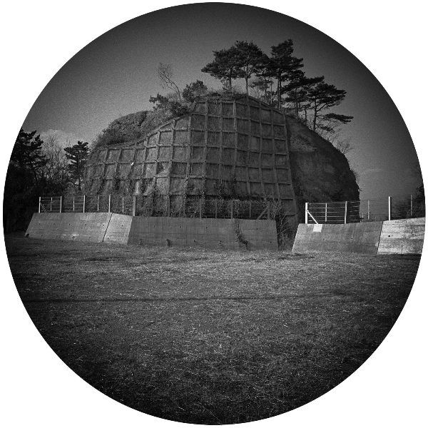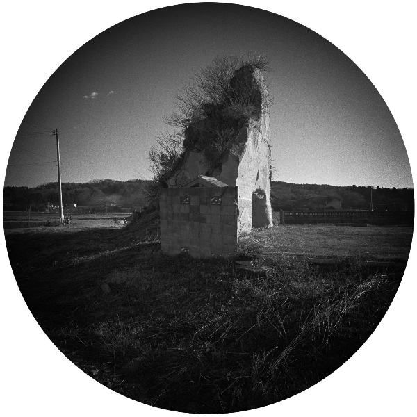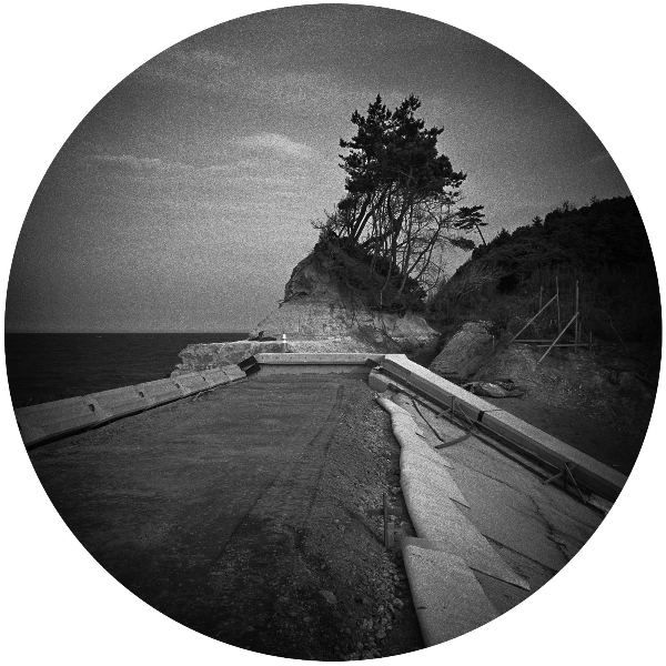 そのために画面の中心近くにあるものやその形――たとえば、木々の幹や枝、木の生い茂る岩山、断崖、小さな島、家屋や建造物、塀など――が際立ち、とくに、岩山や島は円形の画面の中で、△や□の形としてその姿を浮き上がらせてきます。(図 4、5)このように、せまい湾が複雑に入り組み、小さな島が沿岸に点在する三陸海岸周辺地域に固有の景色のなかに岩山や島を抽出された形として意識すると、その側面に見える断層や褶曲、傾斜などの地層の断面に眼が惹きつけられていきます。地殻変動や地震、気候変動など、遥か太古から自然の力が形作ってきた地形の形状と、過去数十年の間に建造されていった道路や建造物、造成地、堤防、消波ブロック、ブロック塀、法面(図6、7、8)のような人工物の組合わさった景色は、その土地に経過していった時間のさまざまな痕跡をとどめています。たとえば、(図8)のように、造成地に残る岩山と、その脇のブロック塀の端や塀の後ろから僅かにのぞく屋根が組合わさっている様子は、人間の生活の営みも、自然の力や経年変化など様々な要因によって姿を変え、やがては朽ちていくものであることを示唆しているようにも思われます。