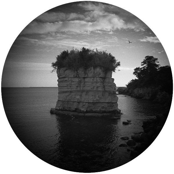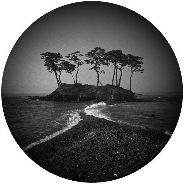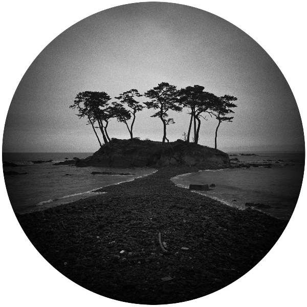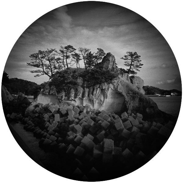 小松は、(図4、6、8)のように陸地にある岩山を(図2、3、5、7)に捉えられているような海に浮かぶ島に対して、「陸に浮かぶ島」と呼び、写真集のあとがきの締めくくりで、「陸に浮かぶ島は、海から遠く隔てられた今でも、海に浮かんでいたときを忘れていないのだろうと想像する。」と述べています。つまり、「遠い渚」とは、写真を撮る小松自身から距離だけではなく、かつては周辺を海に囲まれた島だった岩山からの、時間的、空間的に隔たったところにある地点であることが示唆されています。このように、距離を自分自身が測るものとしてだけではなく、島という被写体から測られるものとしても捉えるような見方は、小松が写真を撮影するにあたって、被写体になる光景と相互に交感する感覚に根ざしているように思われます。津波や地震の被害があった場所の木々を撮り続けるなかで意識するようになったという「陸に浮かぶ島」は、写真が円形に切り取られているがゆえに、景色との関係の中ではスケール感が測り難くなっています。しかし、その島の上に育っている木々や植物が島のスケールを手立てとなり、また小さな島それぞれの存在を静かに語りかける声を秘めて佇んでいるようにも見えるのです。