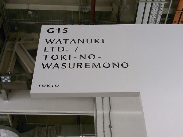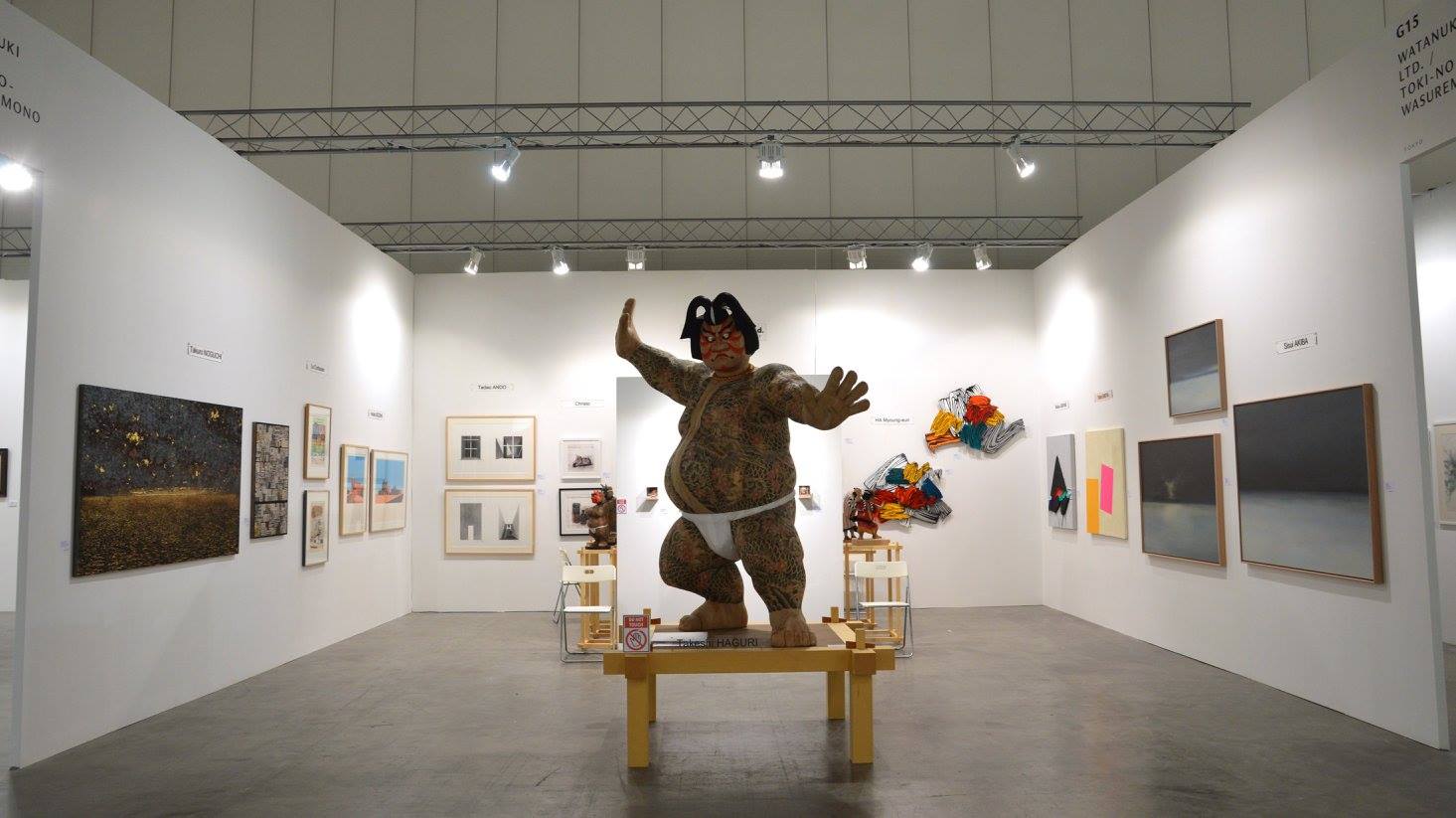 公開初日、朝ホテルで助っ人として参加していただいた柳正彦さんとも合流して会場へ向かい、ブースの最終仕上げに。葉栗さんの新大作である《男気》(KABUKI)の設営は、通りすがった顔見知りの配送会社スタッフの方々にも手伝っていただいたおかげであっさり完了。カッティングシールではなくアクリル板を使った画廊ロゴと作家名の看板も取り付けが完了したときの忘れものブース、今回は以下の様になりました: