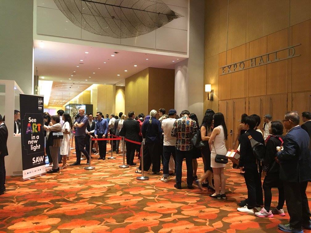 二日目。早朝に現地入りされた箔画家の野口琢郎さんとホテルのフロントで合流し、会場であるマリーナベイサンズへ。昨年と比べた際のアクセスの良さに感動しながらブースに辿り着くと、毎度お馴染みブース内を埋め尽くす木箱、木箱、木箱と木箱。今回も大型木彫を展示する葉栗剛さんと、お弟子の長崎美希さんは翌日合流の為、この日は取り合えず大型作品は木箱から取り出して置いておくに留めて平面作品のみを展示しておき、夕方に現地入りされた葉栗さん、長崎さんと合流後、去年も度々通ったマリーナベイサンズ内の中華レストランチェーン・ディンタイフォンで夕食を食べて終わりとなりました。