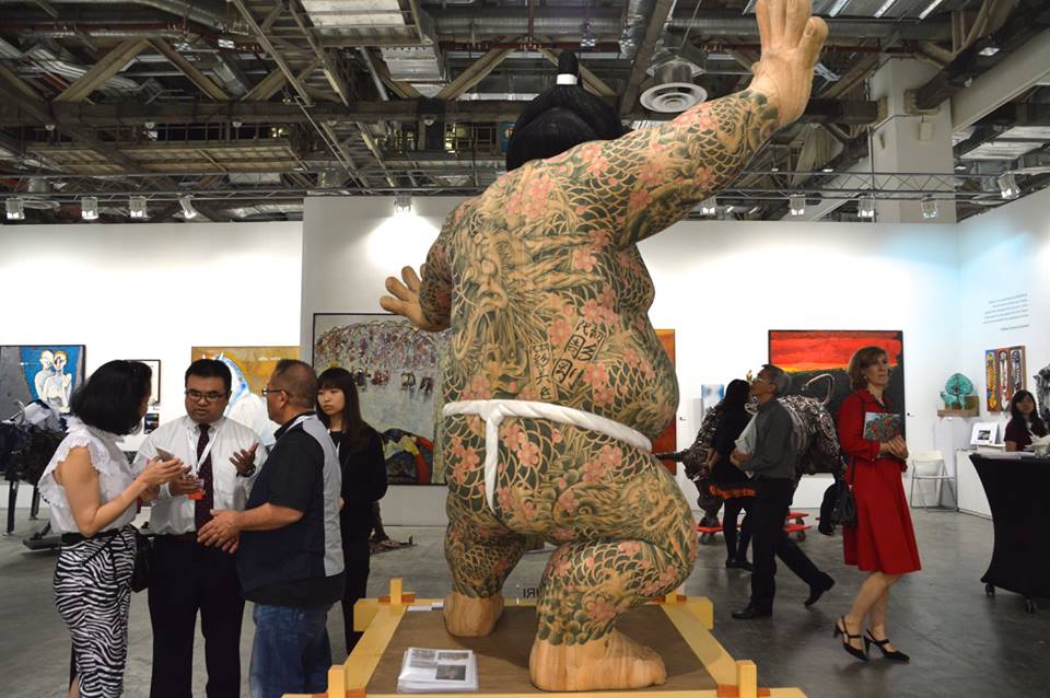 ですが、おかげさまでときの忘れものは昨年ほどではありませんでしたが、社長に笑顔で迎えてもらえたくらいの成果は達成することができました。三年連続、人気抜群の葉栗剛は出品した6点中4点と、日本にある2点が売約。スペースの都合で今回は凹型のストレージに隠れるように展示されていた定番の草間彌生は大判の物から次々と売約となりお持ち帰り。野口琢郎の大作は、昨年ART TAIPEIにいらっしゃった方が来場されて即決で購入。秋葉シスイの作品も会場と日本にある作品が売約となり、シンガポールでは初出品であるハ・ミョンウンの作品もフェア終了間際に売約となりました。反動と言いますか、去年は売れに売れた安藤忠雄は今年は1点のみの売約でしたが、相変わらず注目度は高く、ブース内に来場者を大勢引き込んでくれました。